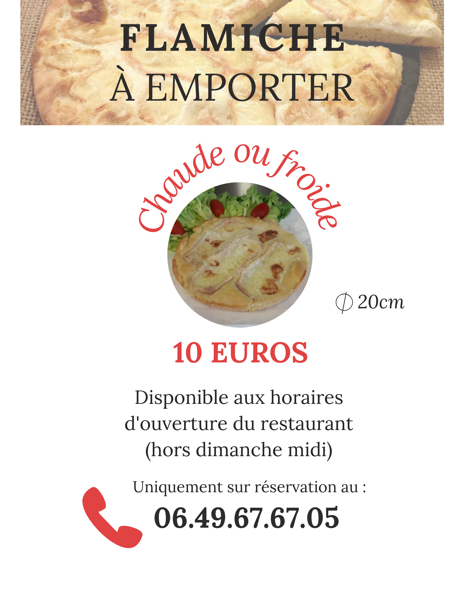 Le restaurant de l'Auberge du Moulin des Prés vous propose la spécialité de la région :"LA FLAMICHE" à emporter, chaude ou froide au prix de 10€ !