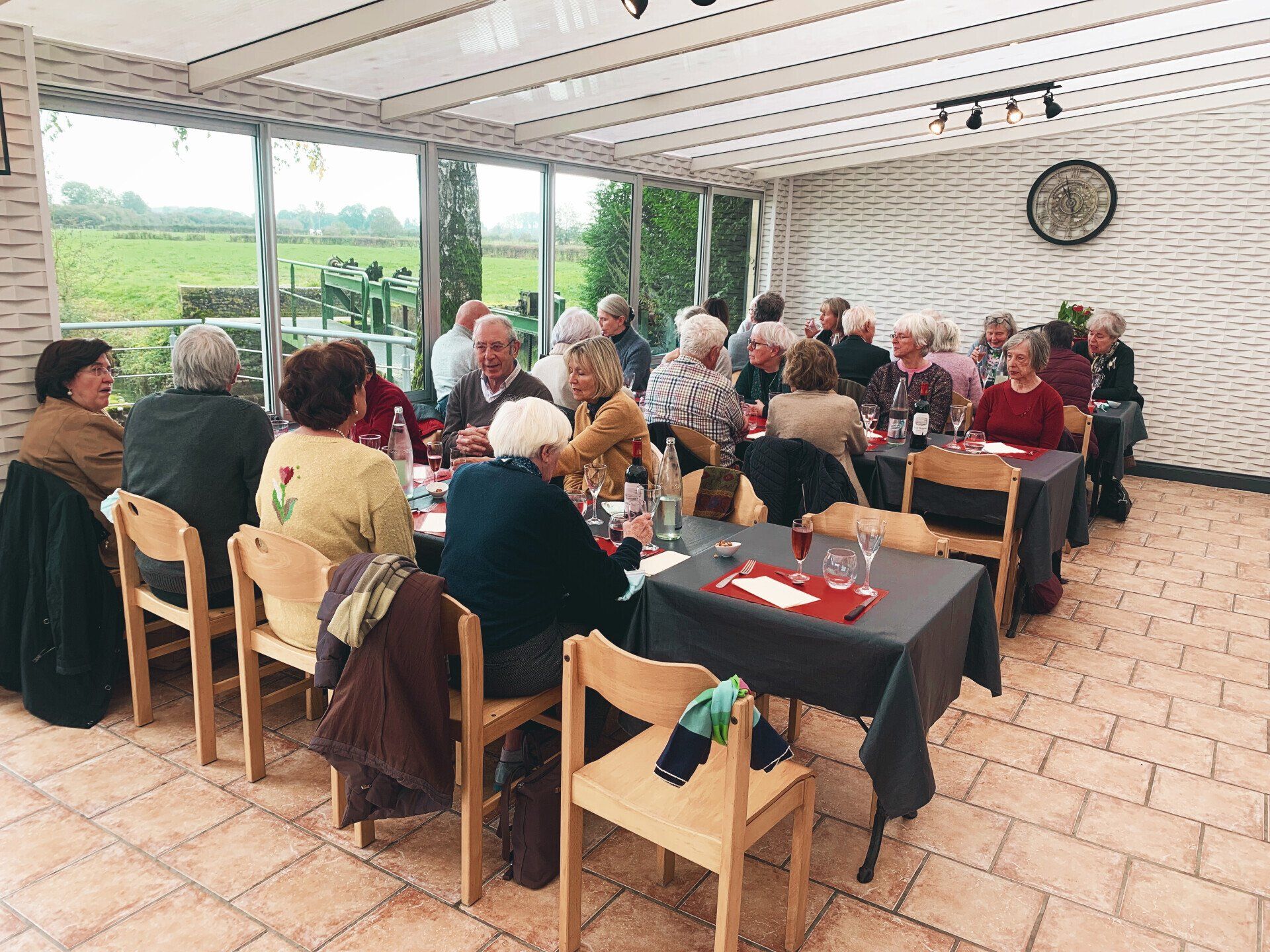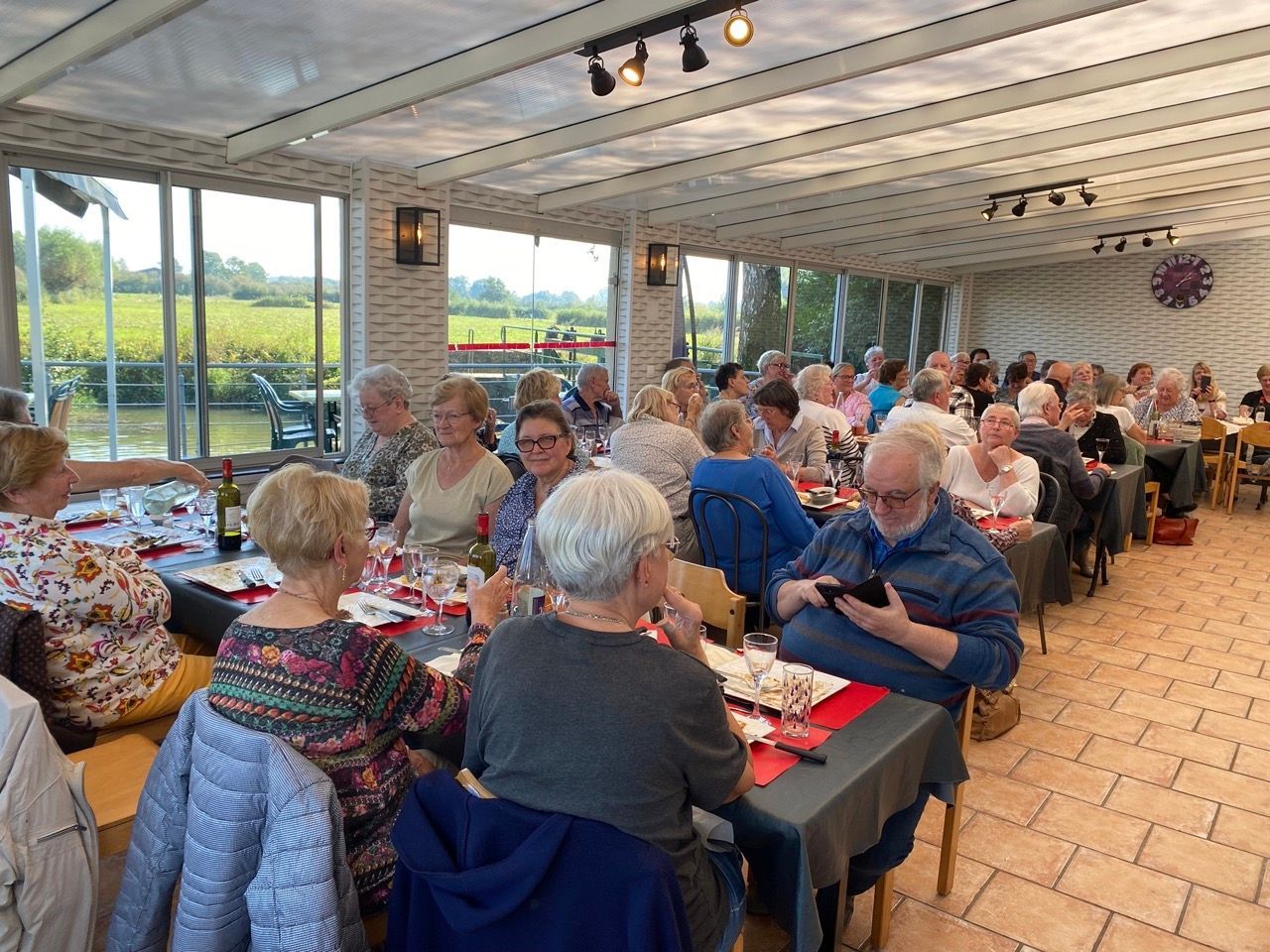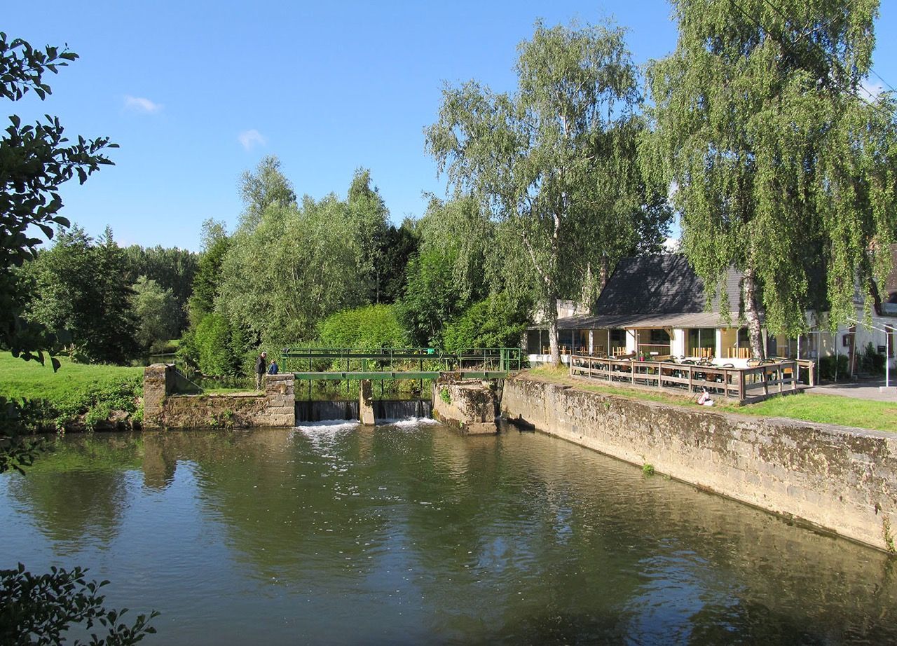 60 personnes en véranda avec vue panoramique sur la rivière et sur le paysage typique de l'Avesnois et 20 personnes dans l'espace bar.